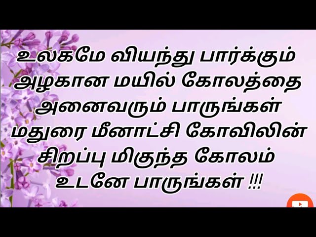 There are many different types of Kolams like that Pulli Kolam, chikku Kolam, Rangoli Kolam, mayil Kolam, paravai Kolam, 3 DOTS kolam, 5 DOTS kolam, 7 DOTS kolam etc...